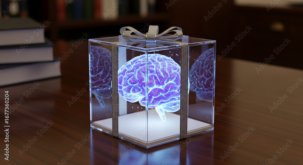 A glowing holographic brain is presented in a clear gift box symbolizing the gift of knowledge a brilliant idea or intellectual property. #1677360204