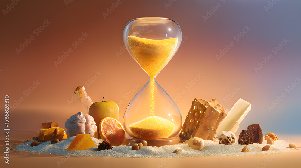 A glowing hourglass with golden sand flowing upwards, surrounded by symbolic objects representing healthy habits against a dawn gradient. #1765826310