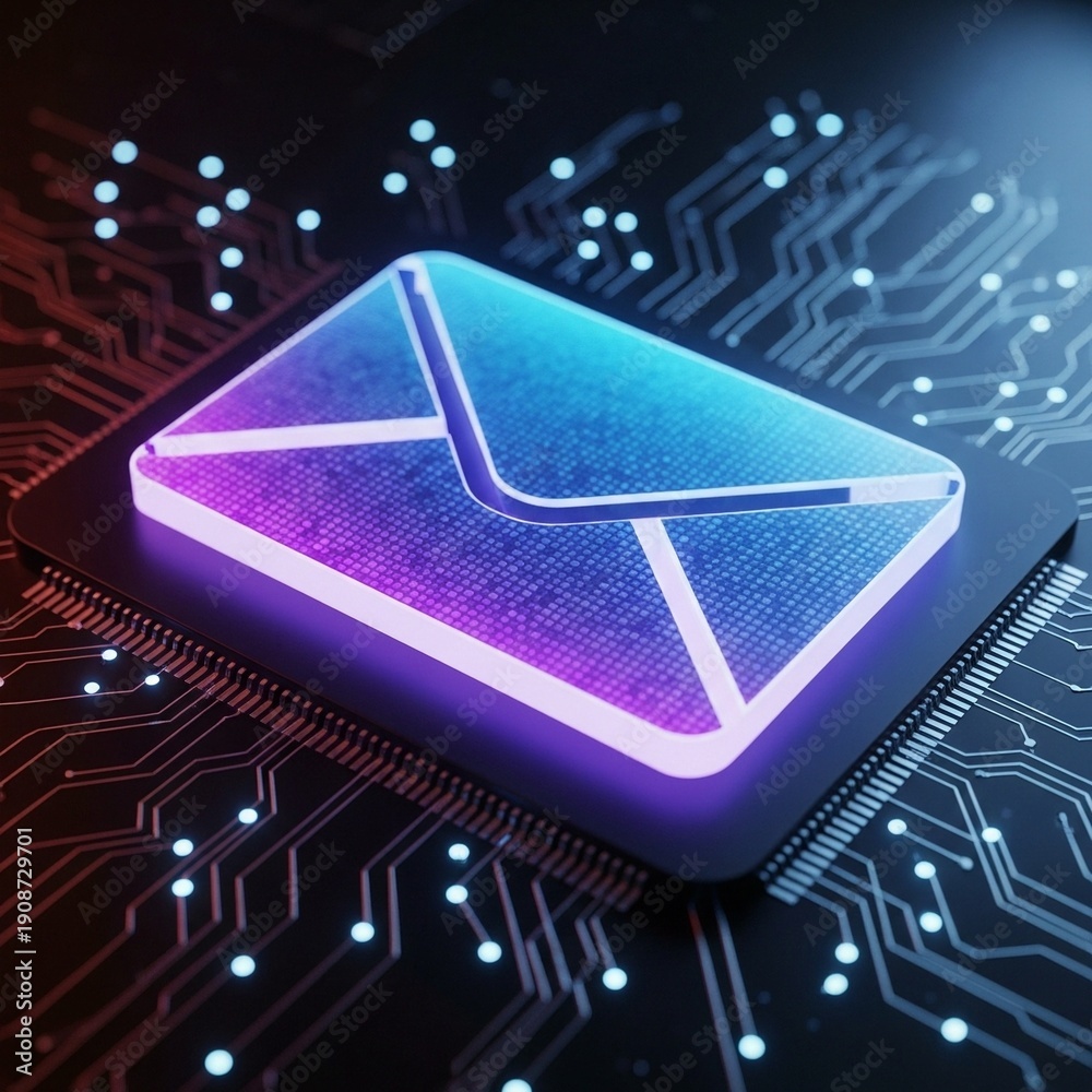 A glowing purple and blue email icon on a dark circuit board background #1908729701