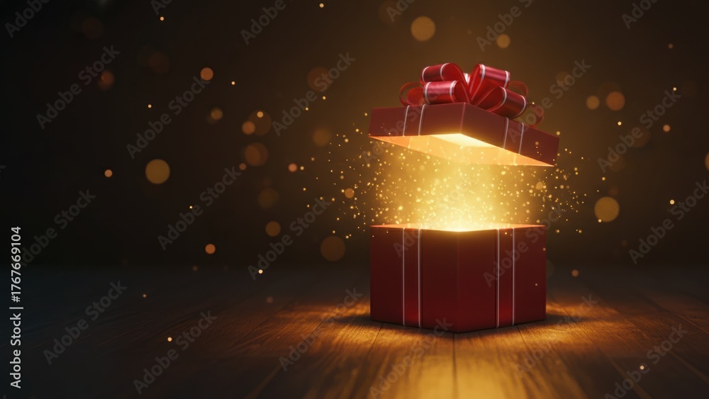 A glowing red gift box with golden light and sparkles shining for magical new year, christmas, and diwali surprise #1767669104