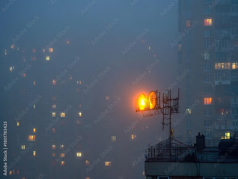 A glowing rooftop antenna burns like a small sun through dense evening fog as distant apartment windows shimmer softly, creating a moody urban scene of haze and light #1801783425