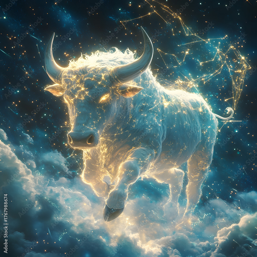 A glowing white bull representing Taurus charges through a nebula sky, its anime-style rider glowing with zodiac power, surrounded by constellations , in a fantasy and anime style, #1767988674