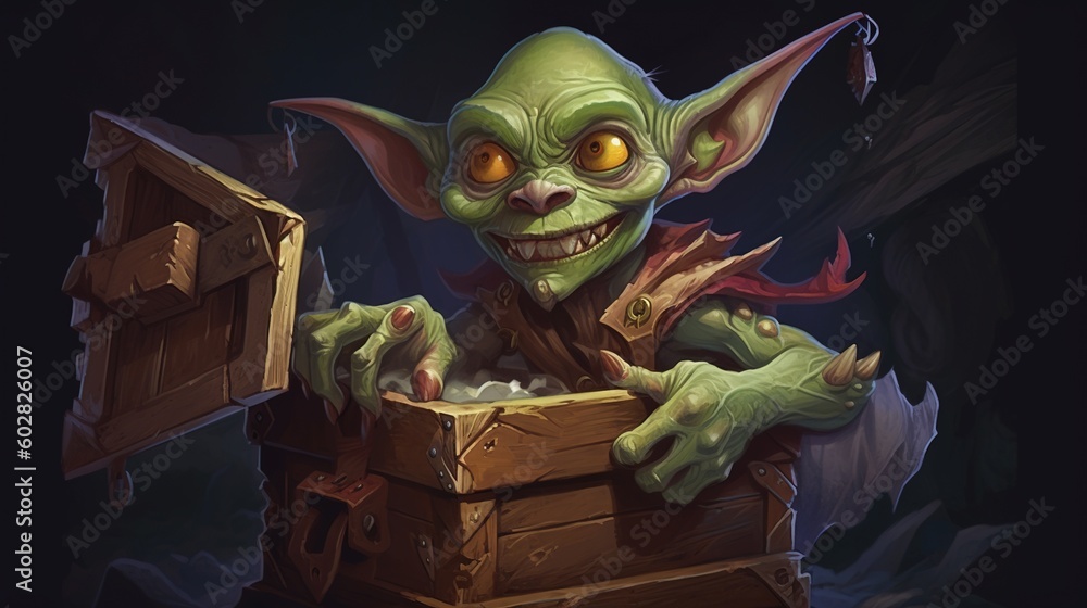 A goblin holding a treasure chest. Fantasy concept , Illustration painting. Generative AI #602826007
