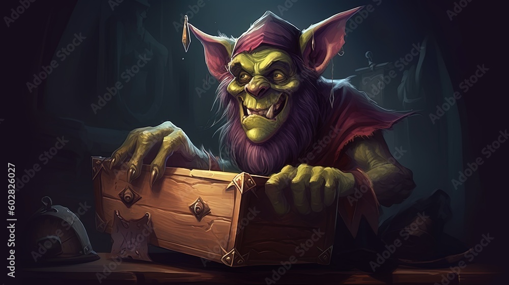 A goblin holding a treasure chest. Fantasy concept , Illustration painting. Generative AI #602826027