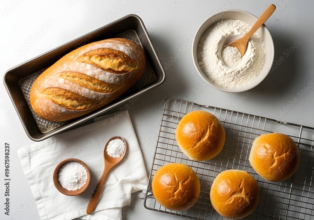 A golden-brown loaf rests inside a metal baking pan, accompanied by freshly baked buns cooling on a wire rack, with flour and salt nearby, presenting a delightful array of homemade bakery items #1967598237