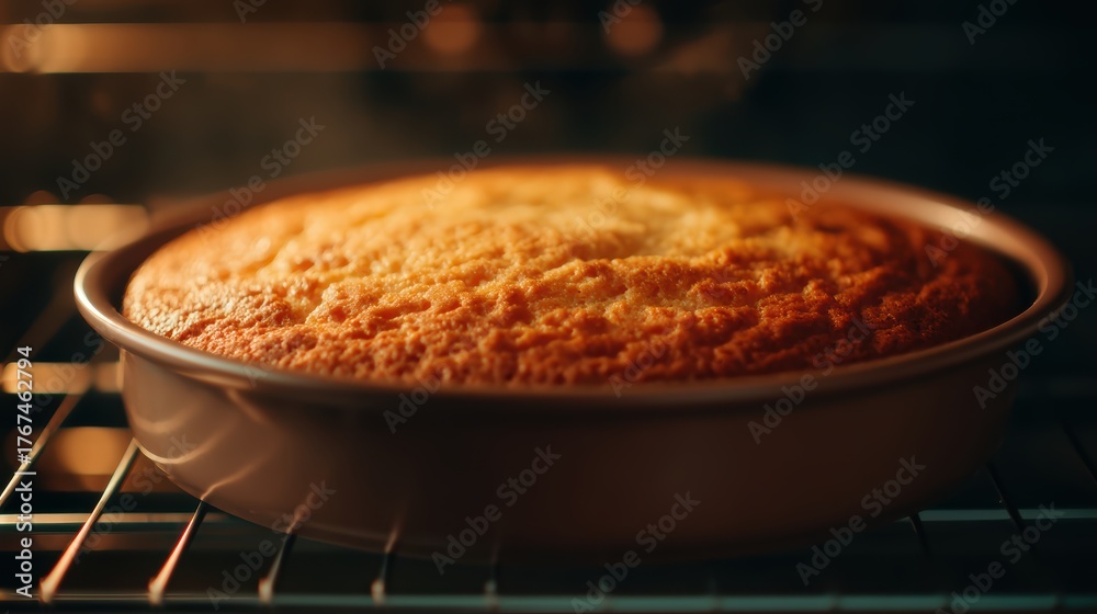 A golden cake bakes in an oven, creating a warm and inviting atmosphere with steam rising around it. #1767462794