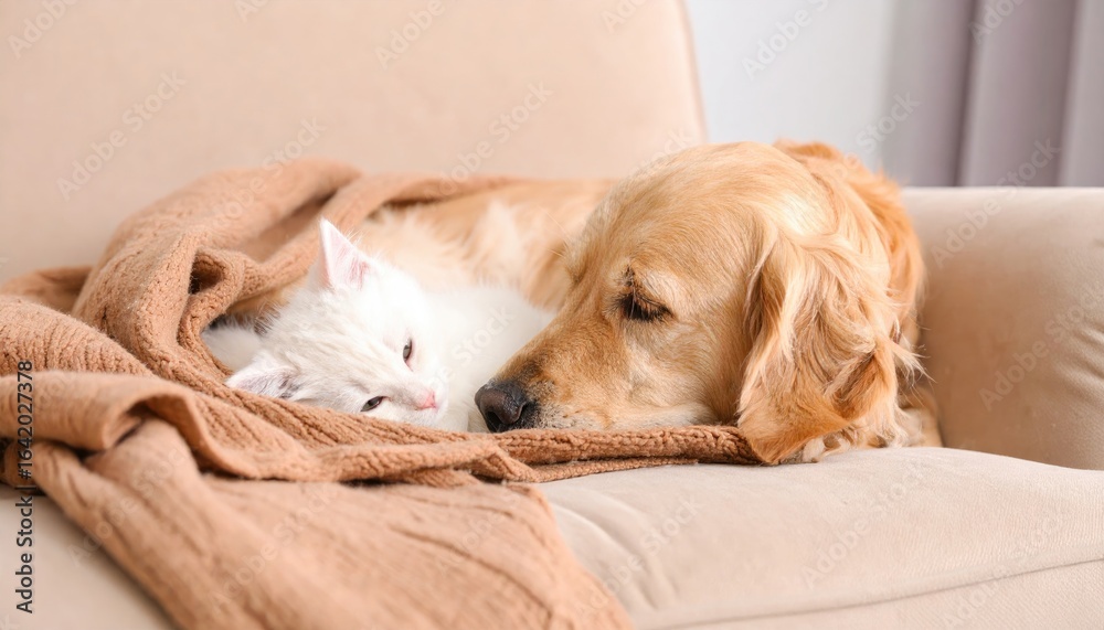 A golden retriever dog and a white cat lie together under a light brown knitted blanket on a beige armchair. #1642027378