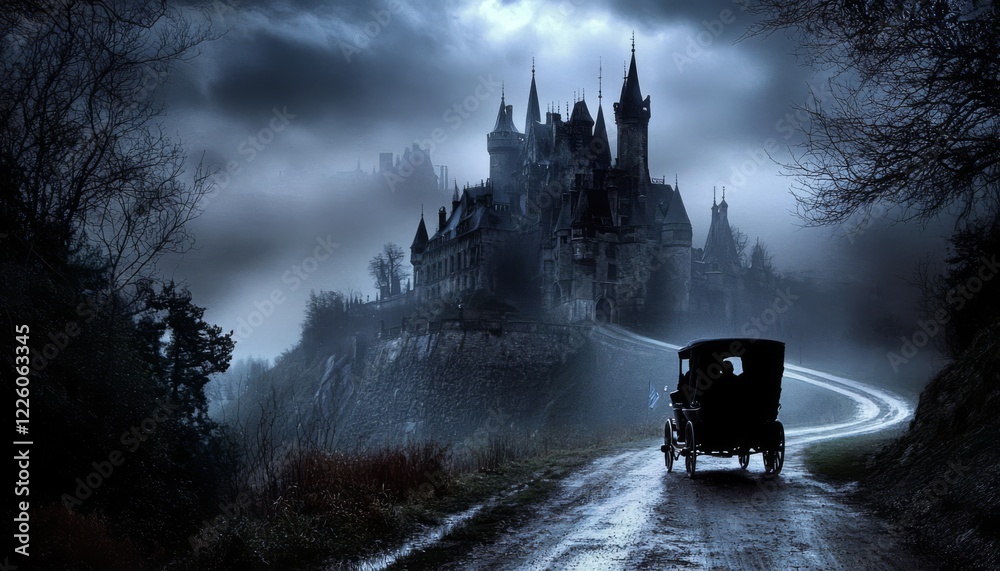 A gothic adventure unfolds as a hansom carriage nears a vampire's lair. #1226063345