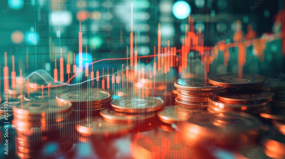 a graph representing financial trends and lines of coins, visually illustrating the intersection of data analysis and monetary transactions in the realm of finance and business. #725784003