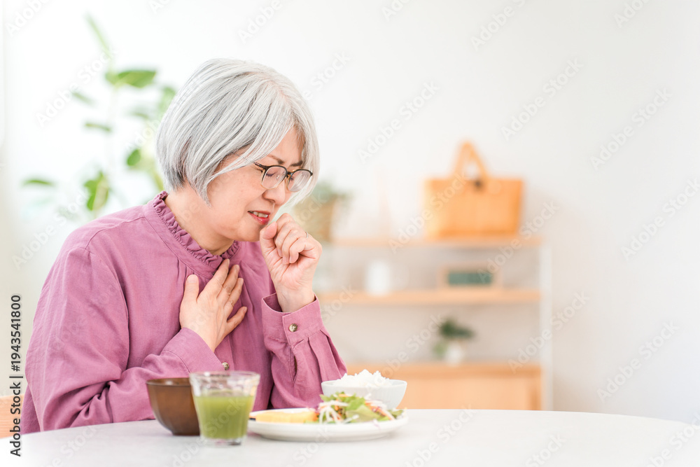 A gray-haired senior woman choking while eating (aspiration pneumonia, swallowing disorder) #1943541800