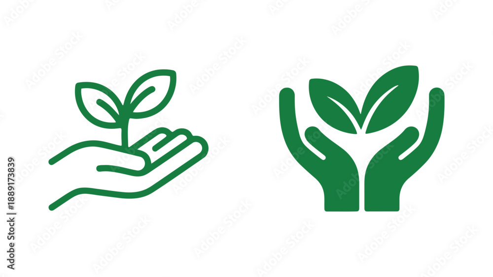 A green icon of hands holding a growing plant symbolizing nature and growth #1889173839