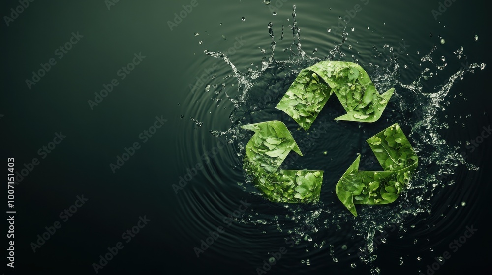 A green recycle symbol made from leaves is submerged in water, creating a splash effect. The dark background emphasizes the symbol's vibrant color. #1007151403