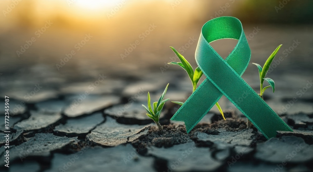 A green ribbon stands among small plants growing from cracked soil, symbolizing hope and resilience in challenging environments. #1772345987