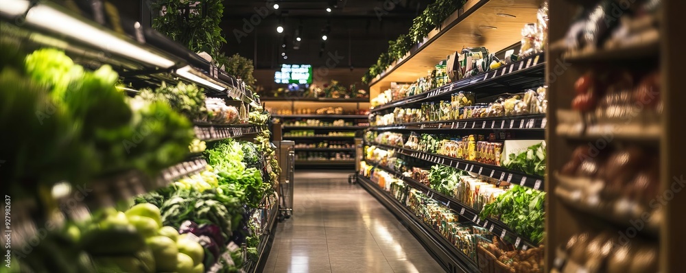 A grocery store with only the highpriced organic section lit, symbolizing economic shifts towards luxury food markets #927982637
