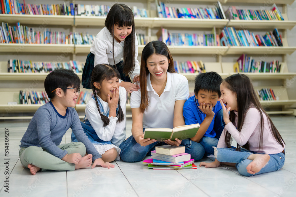 A Group of Asian Student Kid Reading a book with women teacher in School library with Shelf of Books in Background, Asian Kid Education Concept #314809217