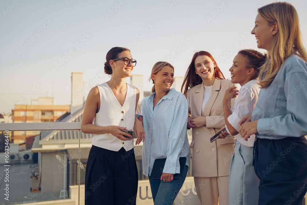 A group of fashionable and stylish women are enjoying a warm conversation on a rooftop #1607346418