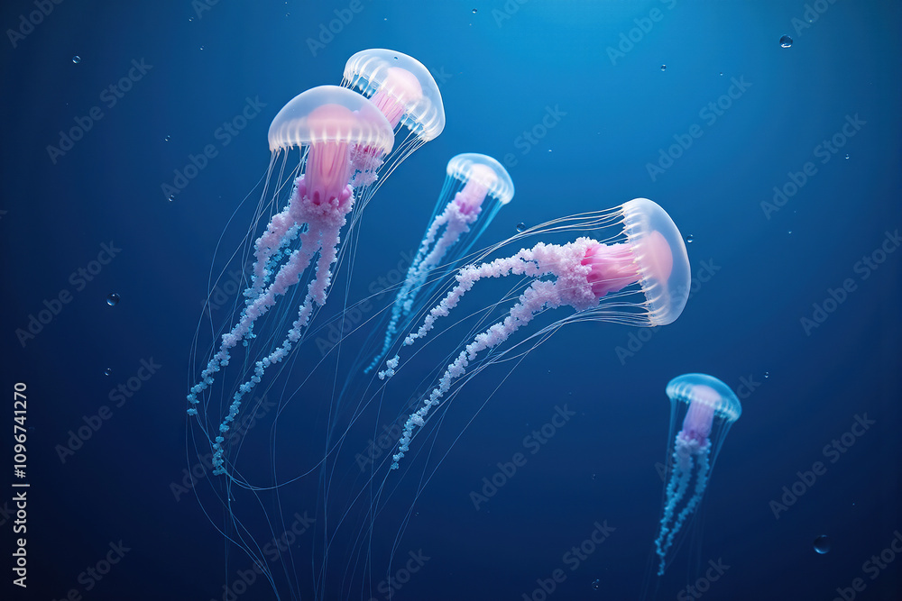 A group of glowing jellyfish floating near the surface of crystal clear water #1096741270
