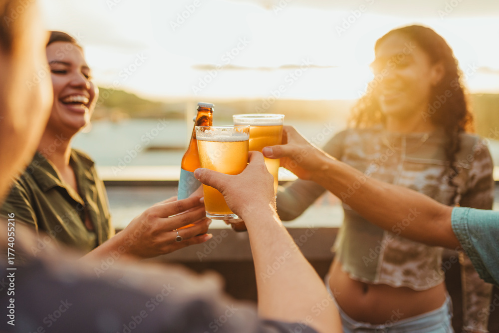 A group of Latino friends sharing laughter and drinks during a cheerful sunset gathering. They toast with glasses and bottles of beer, enjoying the outdoor moment in a relaxed social setting. #1774055216