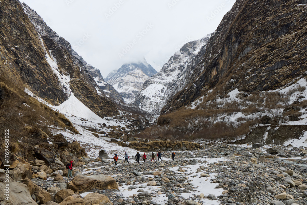 A group of people are trekking a rocky path in the Himalayas toward Annapurna Base Camp, Nepal. Snow dusts the ground and tall mountains surround them. #1769458022