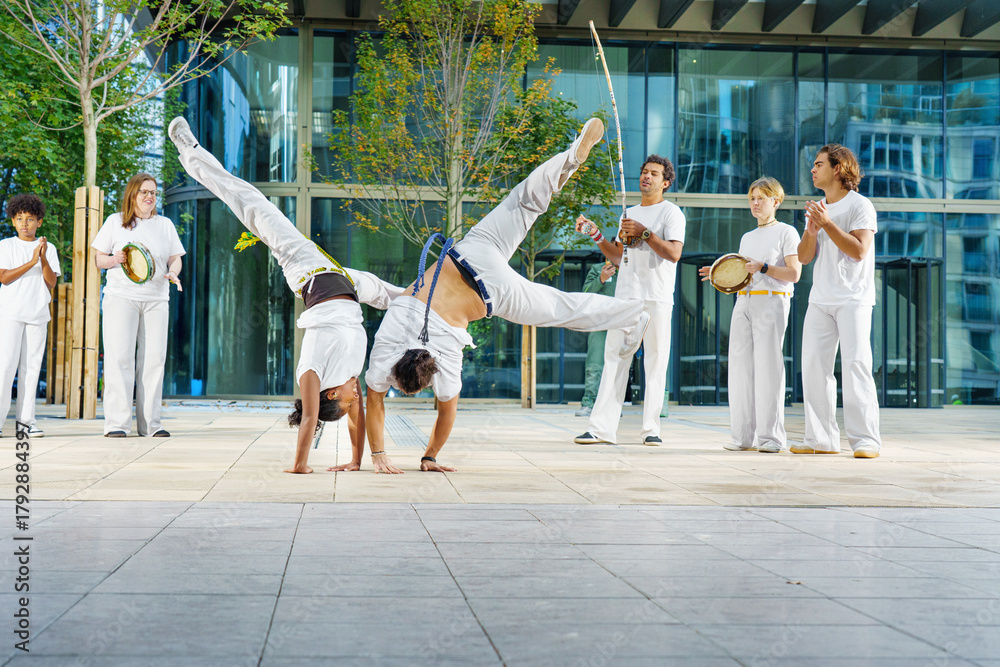 A group of sporty people of different ages training capoeira in a big city #1792884397