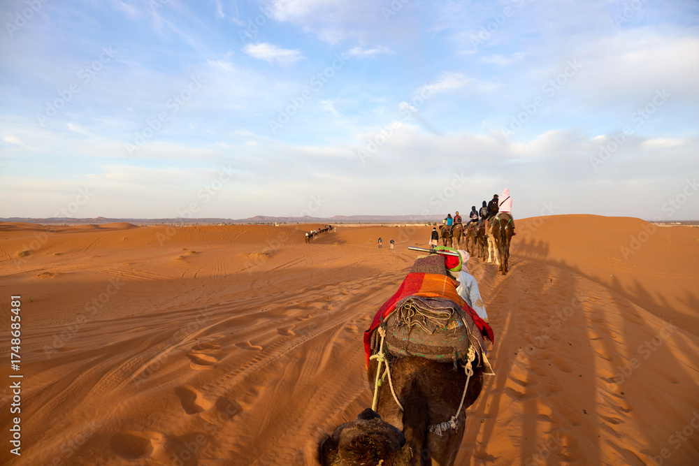 A group of travelers rides camels across the undulating dunes of Erg Chebbi in Merzouga, Morocco. The scene captures the warm hues of sunset illuminating the vast desert landscape #1748685481