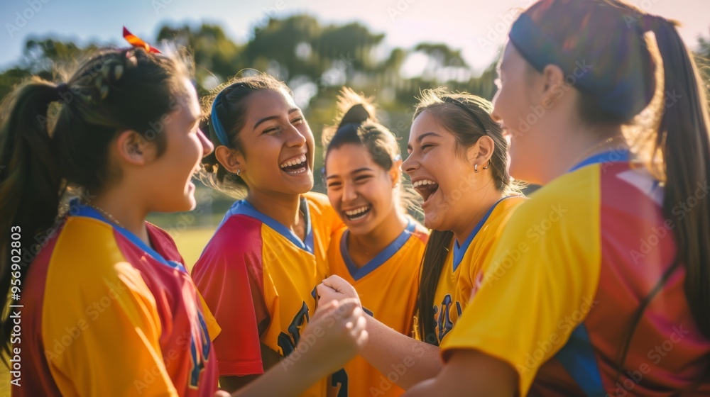 A group of young women in colorful sports uniforms shares a joyous, victorious moment, their laughter and bright smiles shining under the sun. #956902803