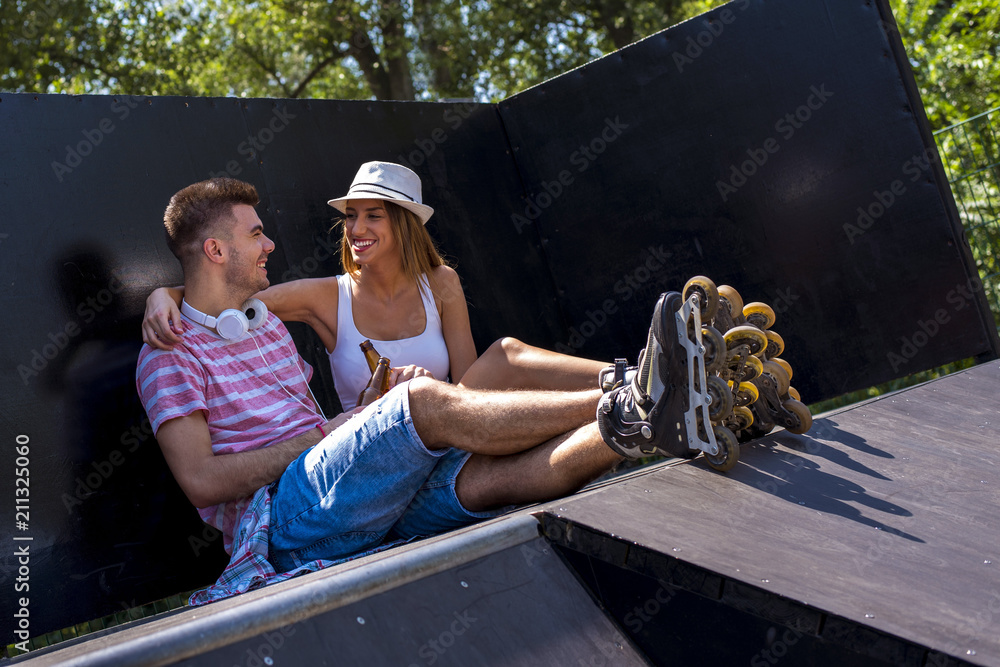 A guy and a girl in roller skates are sitting in a skate park and having fun #211325060