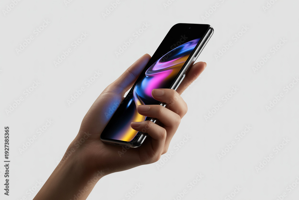 A hand holding a sleek smartphone with a vibrant screen display #1927385365
