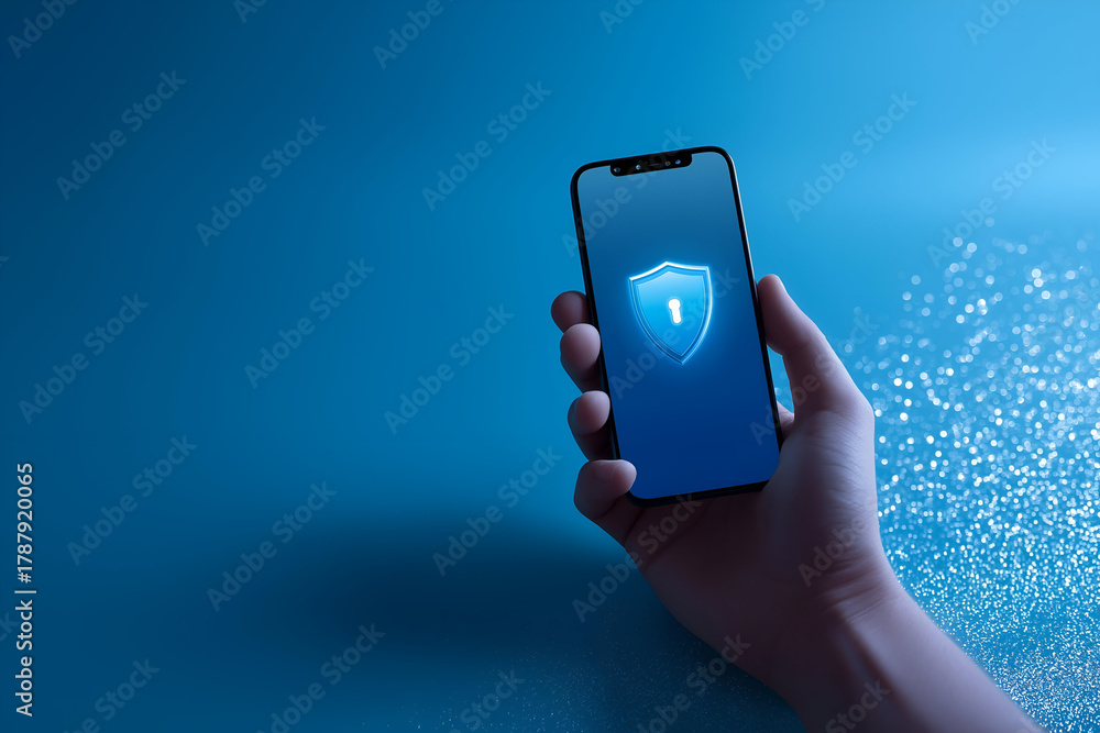 A hand holding a smartphone displaying a digital security symbol on a blue background, representing online safety. #1787920065