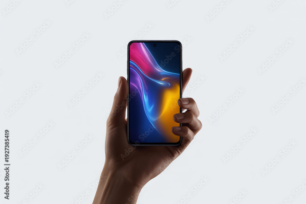 A hand holding a smartphone with a colorful screen against a white background #1927385419