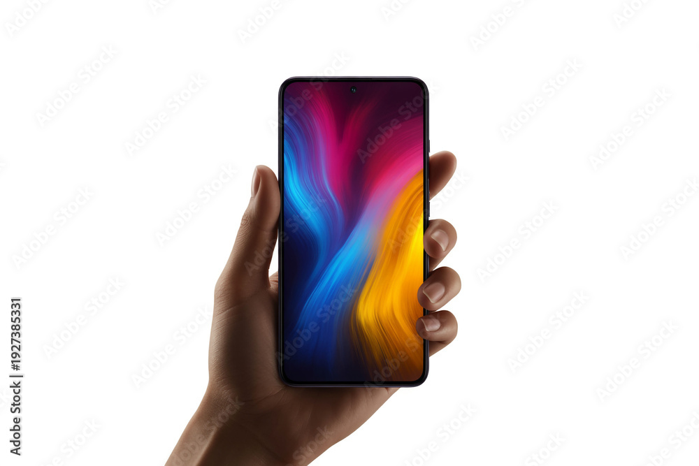 A hand holding a smartphone with a vibrant screen displaying a colorful abstract design. #1927385331