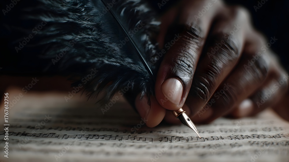 A hand holds a quill pen writing musical notes on an aged sheet of music #1767612756