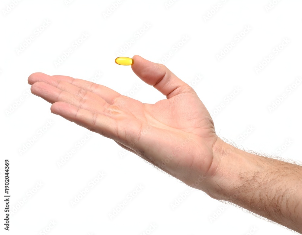 A hand holds a small yellow pill, isolated on white #1902044369