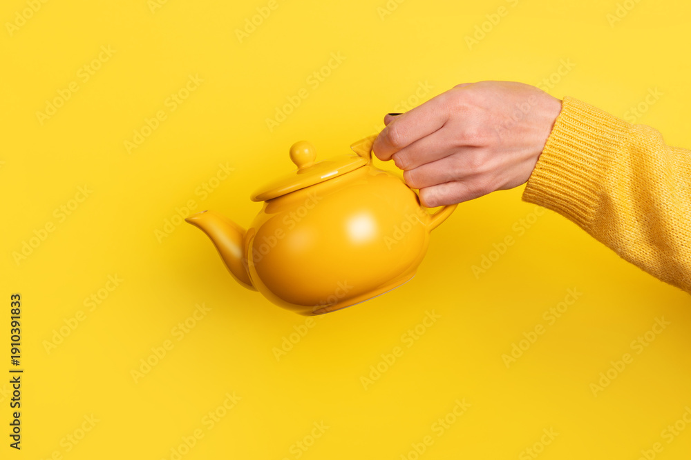 A hand in a yellow sweater holds a yellow teapot against a vibrant yellow background, creating a bold and modern monochromatic composition. #1910391833