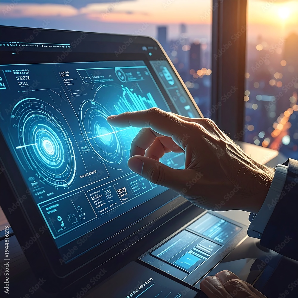 A hand interacts with a futuristic computer screen displaying data #1944816213
