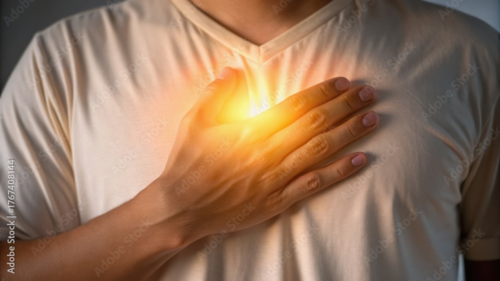 A hand placed on the chest emits a warm glow, symbolizing emotion or spiritual connection, suggesting themes of self-awareness or healing. #1767408144