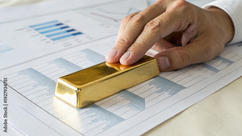 A hand places a gold bar on financial documents featuring charts and graphs, symbolizing investment, wealth, and financial growth. #1927934751
