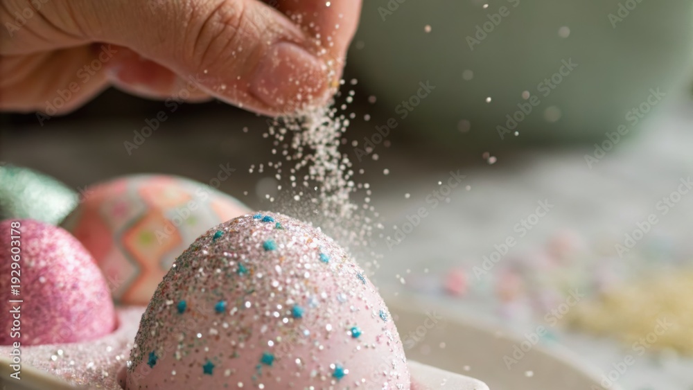A hand sprinkles white sugar crystals onto decorated pastel Easter eggs with glitter and star patterns. #1929603178