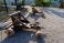 A handmade wooden cart used for going up and down mountain slopes rests on a gravel path under the bright afternoon sun, surrounded by trees and a view of distant hills and greenery. #1439313803