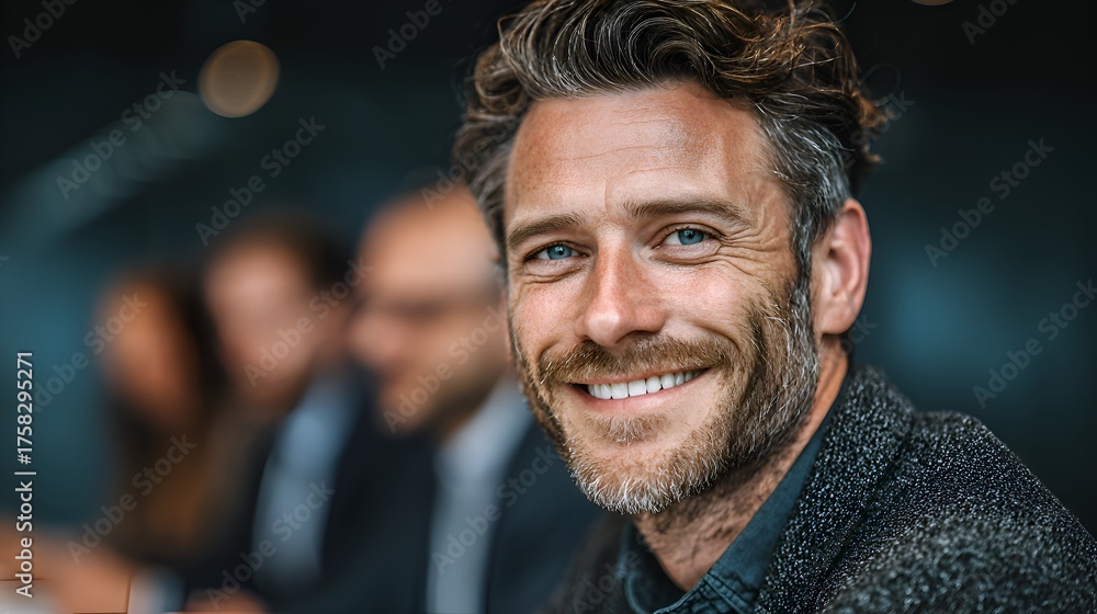 A handsome mature businessman smiles confidently du a corporate meeting with his blurred colleagues nearby. #1758295271