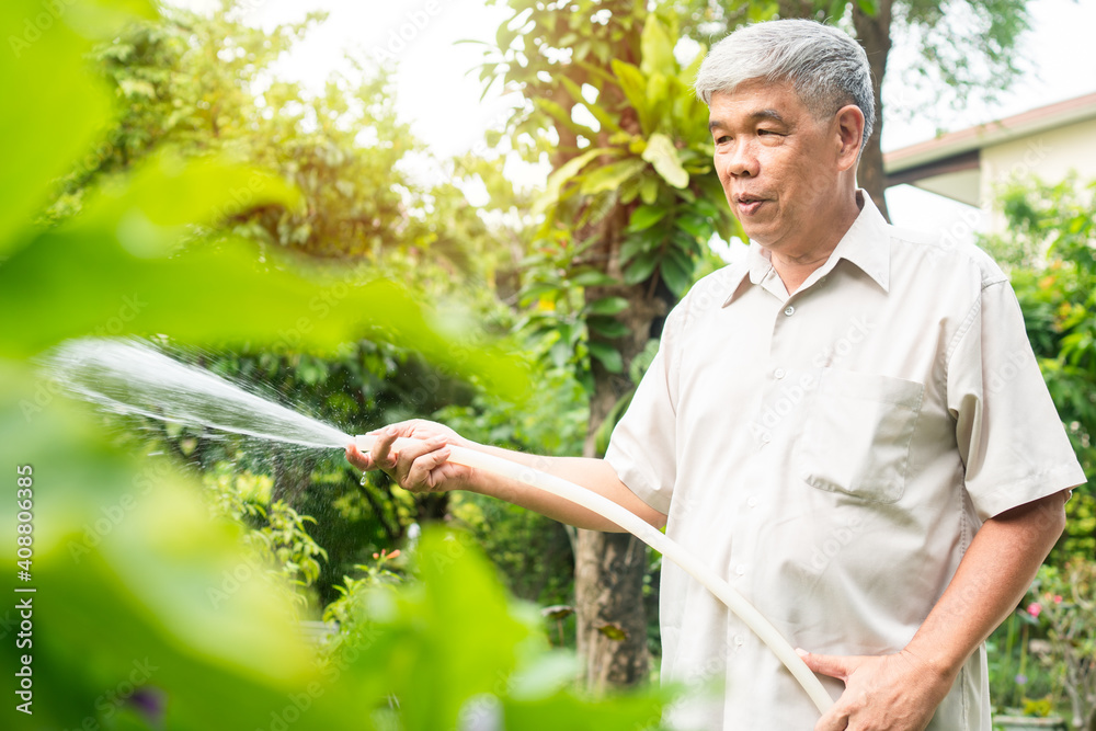 A happy and smiling Asian old elderly man is watering plants and flowers for a hobby after retirement in a home. Concept of a happy lifestyle and good health for seniors. #408806385