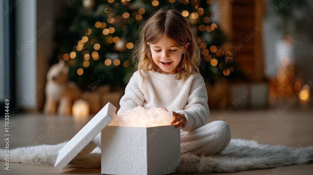 A happy child opens a glowing gift box while sitting on a soft rug next to a Christmas tree decorated with golden lights. Magic, surprise, and joy. A winter holiday backdrop #1763514469