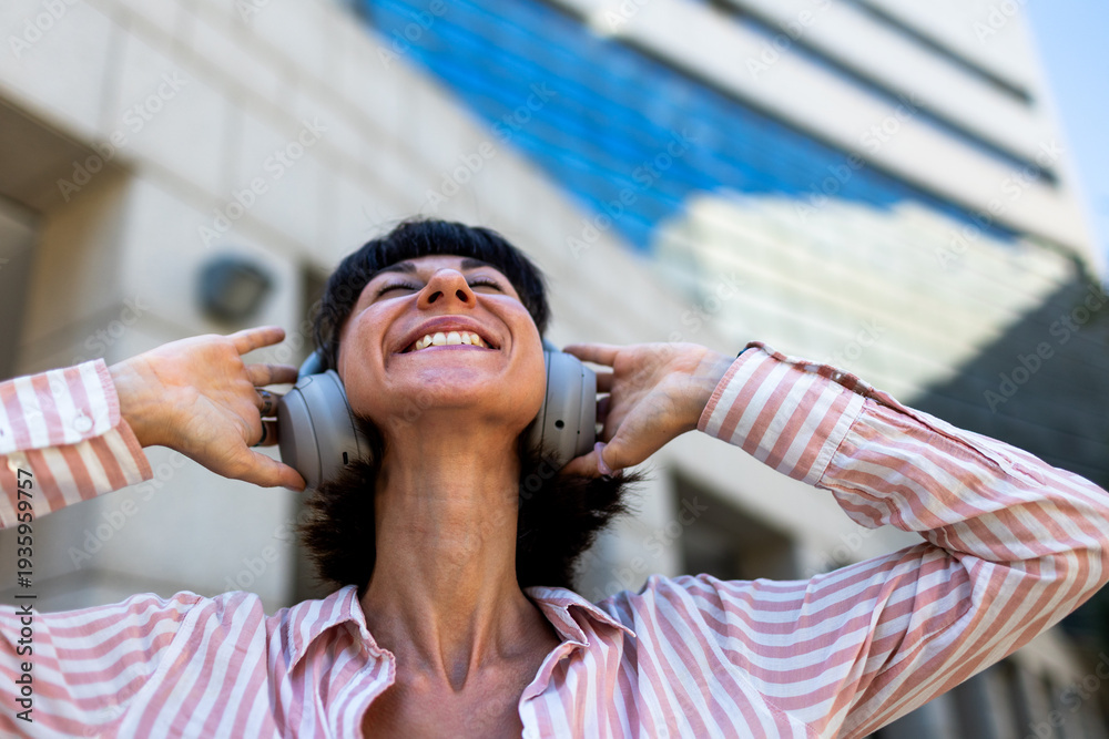A happy white woman, relaxed and carefree, walks down the street, listening to music on headphones and dancing to the beat. Listening to her favorite song. #1935959757