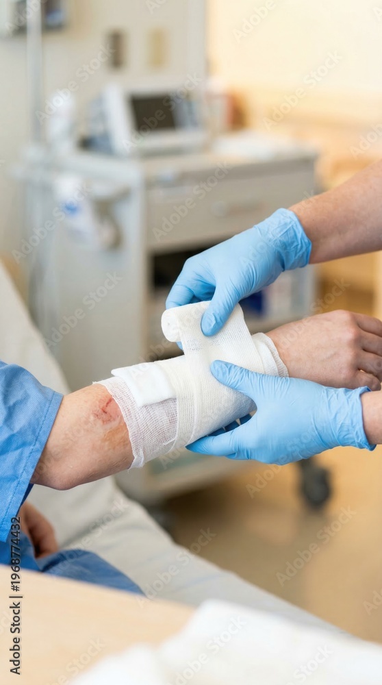 A healthcare professional in blue gloves is applying a bandage to a patient's injured arm in a hospital setting. The patient is wearing a blue gown. #1968774432