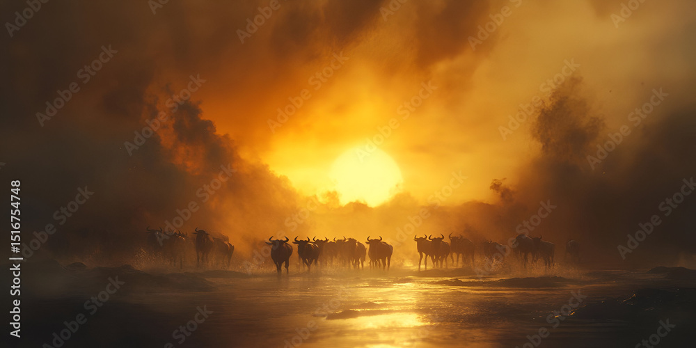 A herd of wildebeests crossing a river during the dry season, their bodies silhouetted against the rising sun. The swirling dust and harsh light add a sense of drama and struggle in their migration. #1516754748