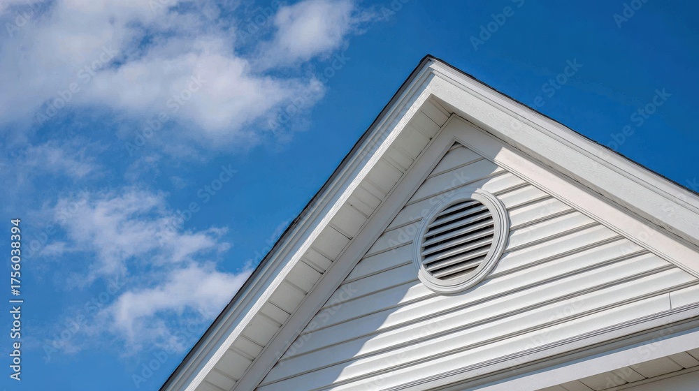 A High Resolution image of close up of white vinyl siding on a house with a blue sky. #1756038394