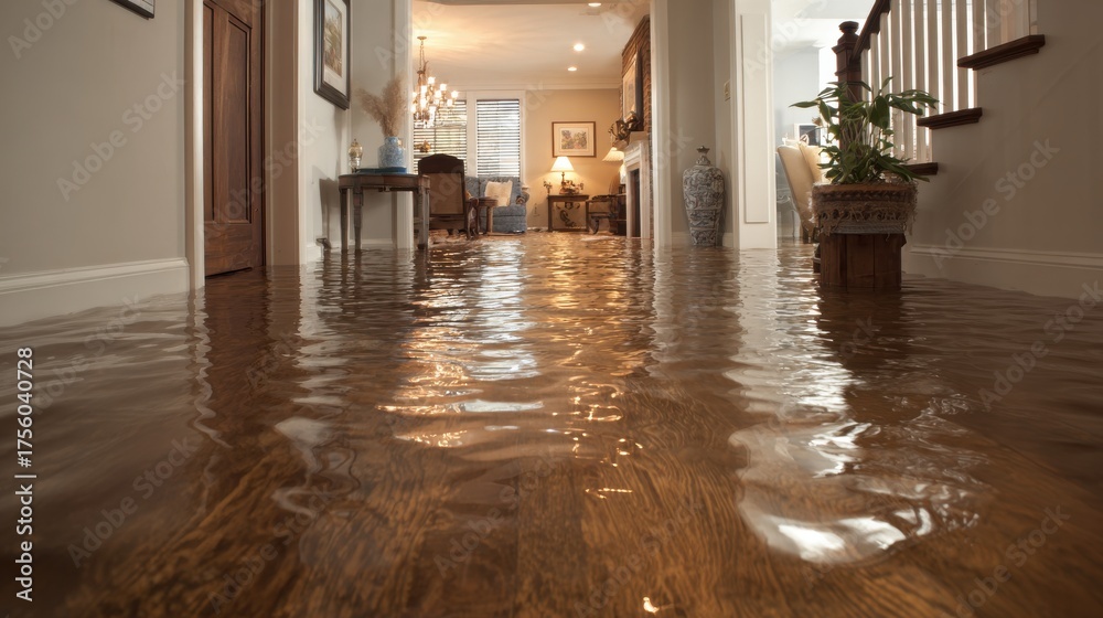 A High Resolution image of flooded hallway in a residential home with water damage. #1756040728