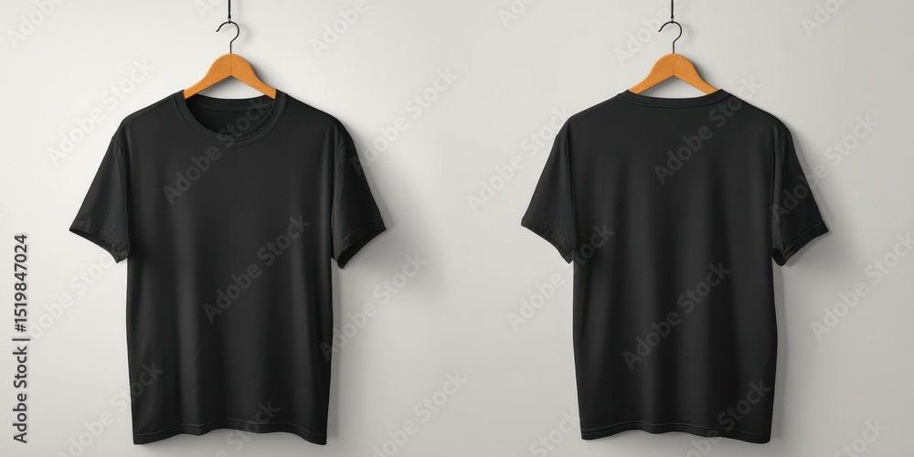 A High Resolution image of mockup of black t-shirt, front and back view, hangs on wooden hanger. Clothes template for design. Apparel advertising concept. Blank tshirt for branding. #1519847024