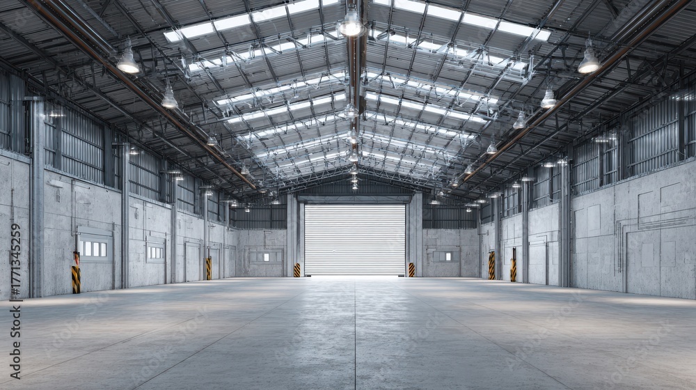 A High Resolution image of spacious empty industrial warehouse interior with concrete floor and metal roof. #1771345259
