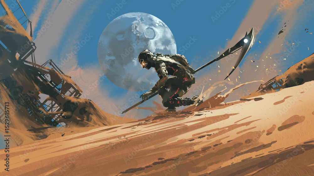 A high-tech armored warrior wields a glowing scythe while moving through a windswept desert filled with ruined structures and a massive moon overhead, digital art style, illustration painting #1529615713